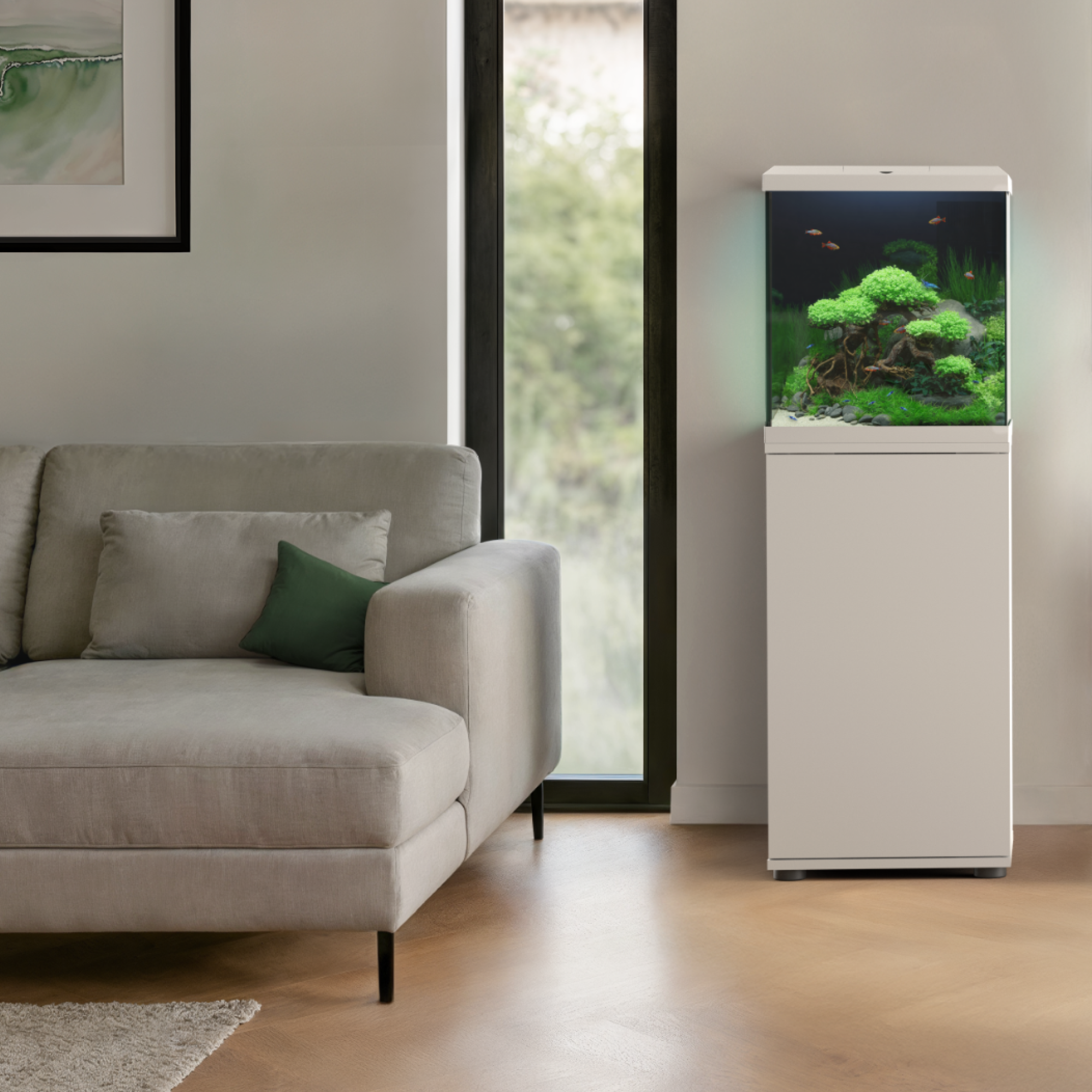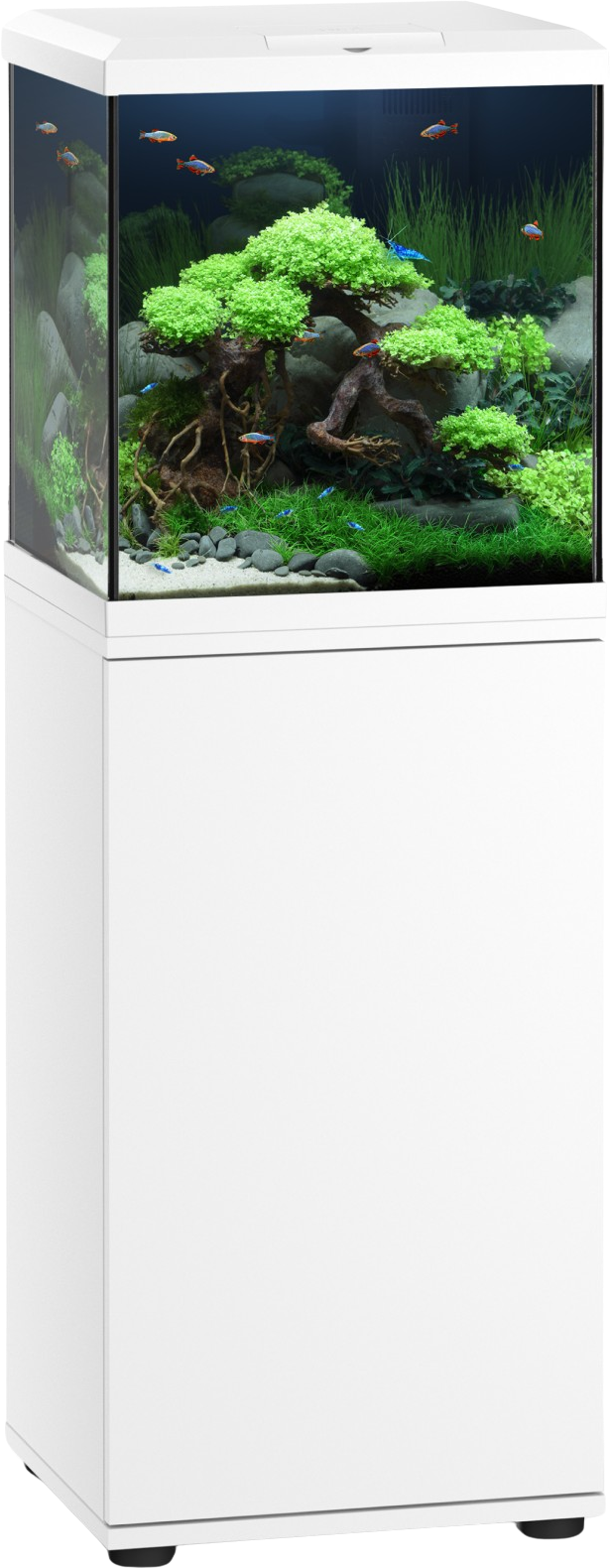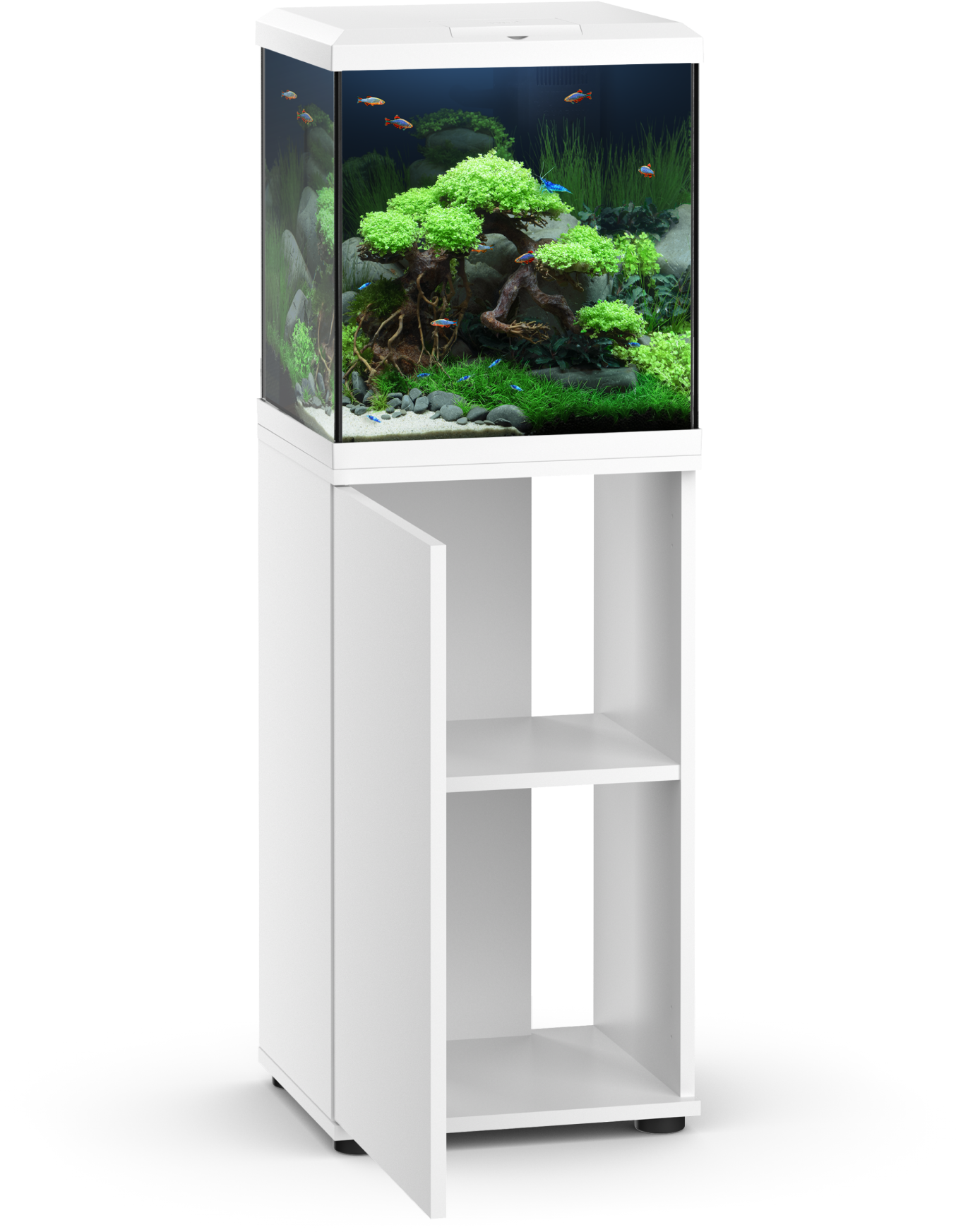 It is easy to assemble, so your new aquarium project will be ready to go in no time. Behind the opaque door, there's plenty of storage space to keep fish food and aquarium accessories neatly organised and within easy reach. This ensures that nothing disrupts the minimalist look of your aquascape!