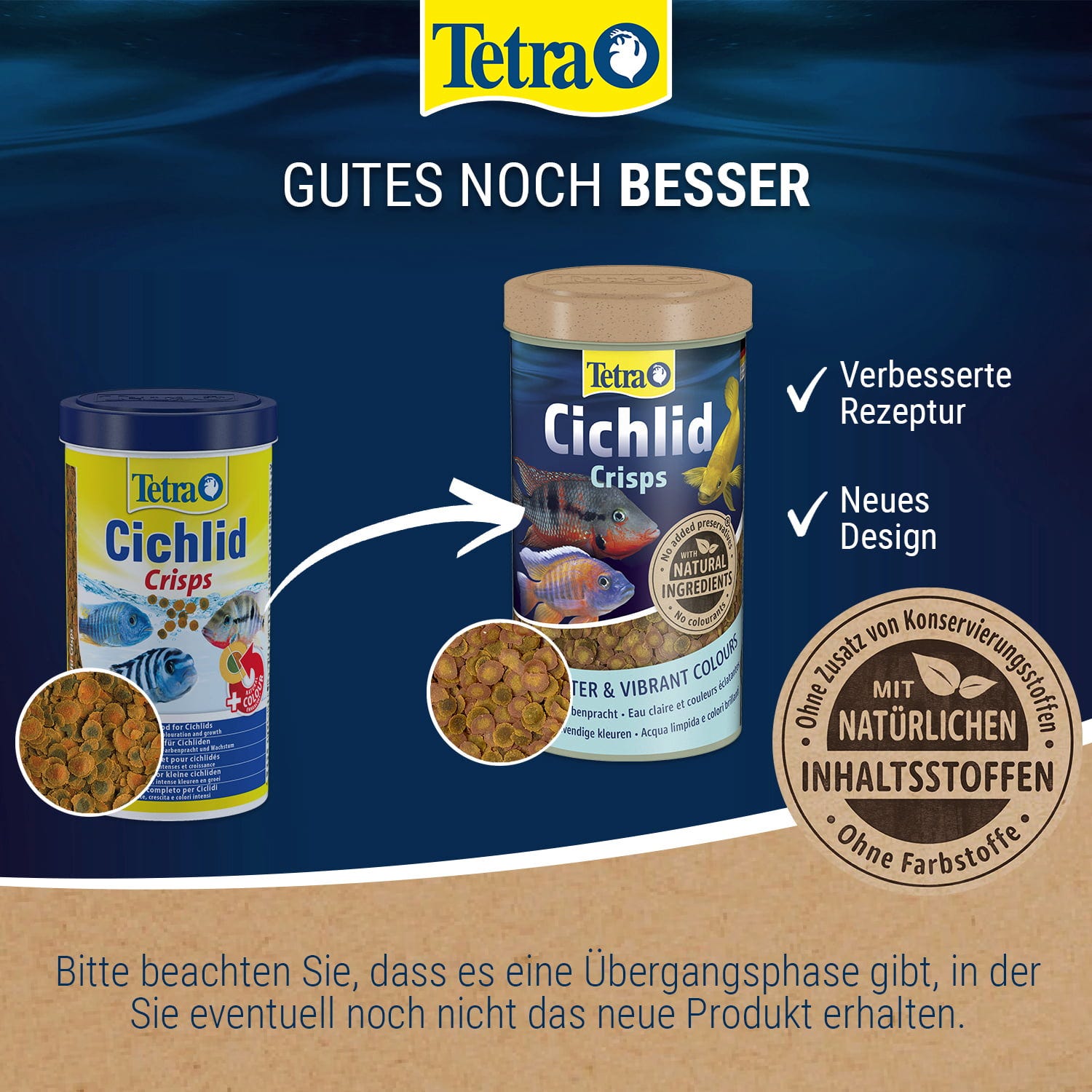 Tetra Chichlid Crisps should be fed several times in small portions as the fish can eat in about 5 minutes. Use the crisps in the community aquarium together with TetraMin Flakes / Granules or TetraPro. For a varied diet, feed Tetra Delica 2-3 times a week. The best-before date on the packaging indicates the point in time until which the feed remains intact when sealed and properly stored. The opened feed box should be fed within 3 months because moisture, air and light break down the nutrients in the feed and thus impair the supply of essential ingredients.