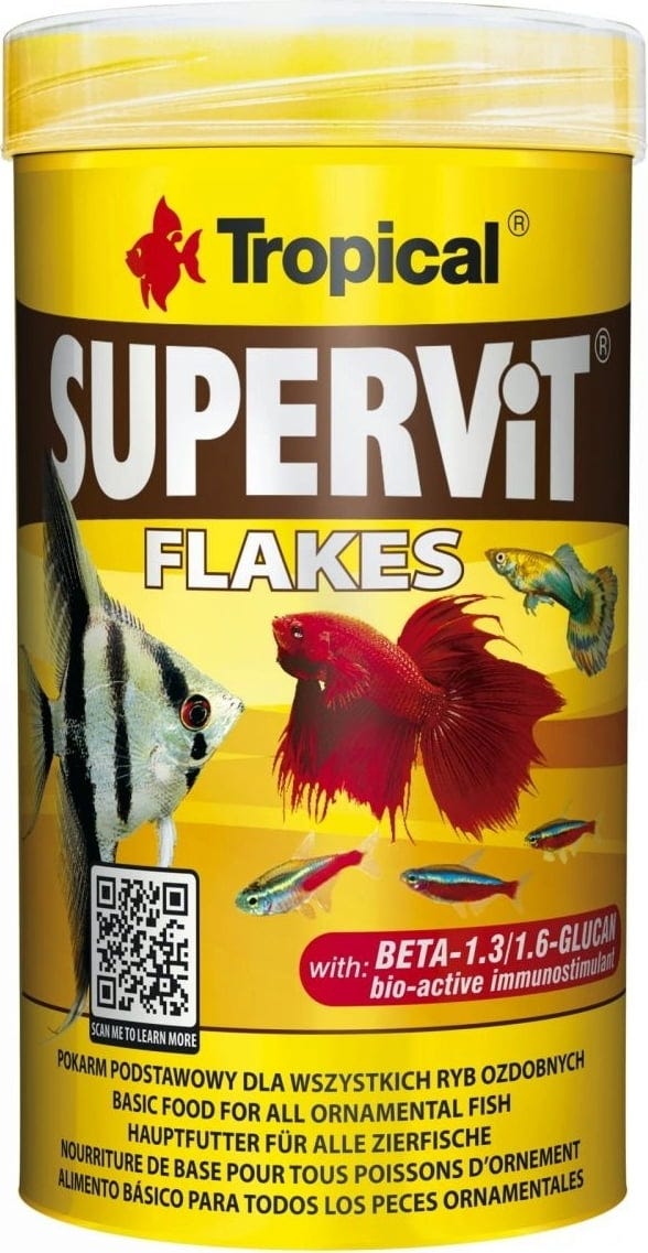 Supervit Flakes is a high-quality, nutrient-rich complete food in flake form for the daily feeding of all aquarium fish. It contains a blend of ingredients tailored to meet the diverse dietary needs of fish kept in aquariums with mixed fish stock. The food includes the natural immune stimulant beta-1,3/1,6-glucan and stabilised vitamin C, which can help support the immune system of your fish.
